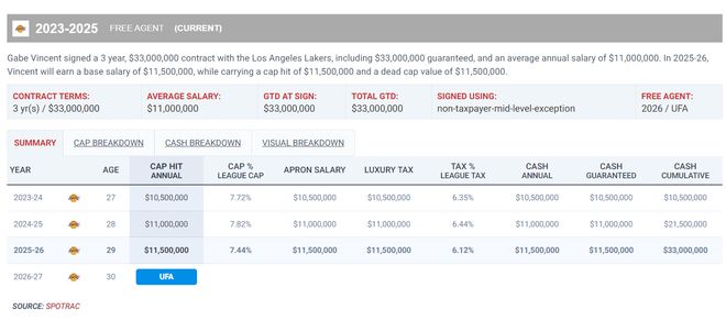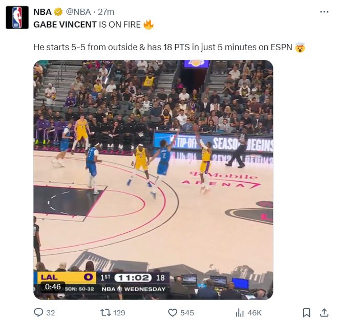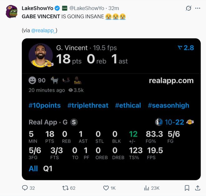 盖布-文森特又迎来了一场高光时刻,NBA季前赛湖人VS独行侠的首节,他先发登场连续命中5个三分球,短短5分钟连拿18分技惊四座,而且他是在2.06米身高的弗拉格追防的情况下连中三分。这场比赛开场文森特实在是太过于神准了,隔着三分线一步就能投,弗拉格封到脸上也能进,湖人替补席是各种起立欢呼,文森特有这样的表现何愁霸业不成?湖人官方写道,文森特刚刚连续命中了五个三分球。勒布朗-詹姆斯发推:文森特简直发疯了,这太让人感到惊讶了!短短5分钟,5中5+罚球3中3拿到18分。开场文森特带领湖人打出了22-10的小高潮,湖媒写道:文森特这太疯狂了(爆哭表情)。NBA官方也全记录了文森特这一波三分球5中5,文总真的回到22-23赛季热火季后赛时期那种巅峰手感了?不过第二节6分钟里文森特1中1只拿到1分1助攻被换下。文森特今年只剩下一年1150万的合同,他多次陷入交易流言当中,他、里夫斯、克内克特、克勒贝尔、八村垒这些球员几乎是‘换遍全联盟’,湖人媒体每一次的交易建议都会拿他们当筹码,如今文总这个状态,还换吗?美媒NBA Memes写道,文森特今晚就是库里附体。此前文森特出战的两场季前赛发挥也不错,一场13分+三分4中2,一场16分+三分7中3,每一场的三分球命中率都超过四成。