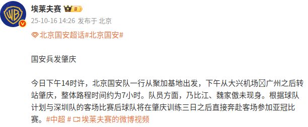 博主:国安队今天赴广东备战与深圳的比赛,乃比江未随队出征