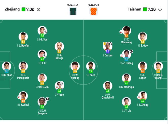 【出场阵容】浙江队首发:门将:33-赵博;后卫:5-刘浩帆、36-卢卡斯(F)、81-张瑷晖(46’16-童磊);中场:26-孙国文、10-李提香、20-米特里策(F)、22-程进、31-奥乌苏(F);前锋:27-亚戈-卡列洛(F)(80’11-弗兰克(F))、39-王钰栋;浙江队替补:1-董春雨、32-霍深坪、2-梁诺恒、3-王瑒、24-汪士钦、6-姚均晟、8-钱杰给、29-张佳祺、7-陶强龙、13-麻皓齐。山东泰山首发:门将:14-王大雷;后卫:5-郑铮(79’55-彭啸)、11-刘洋、15-路易斯-洛佩斯(F)、33-高准翼、23-谢文能(46’6-王彤);中场:8-马德鲁加(F)、9-克雷桑(F)、35-黄政宇(74’22-李源一);前锋:10-卡扎伊什维利(F)、19-泽卡(F);山东泰山替补:32-孙启航、51-刘琪玮、17-吴兴涵、27-石柯、31-赵剑非、21-刘彬彬、29-陈蒲、38-李小恒。