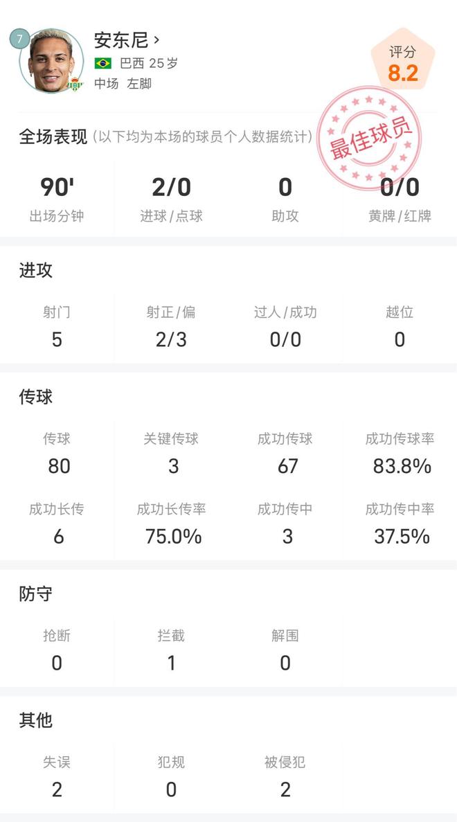 - 西甲 | 安东尼全场数据:2次射正2粒进球,赛后评分全场最高