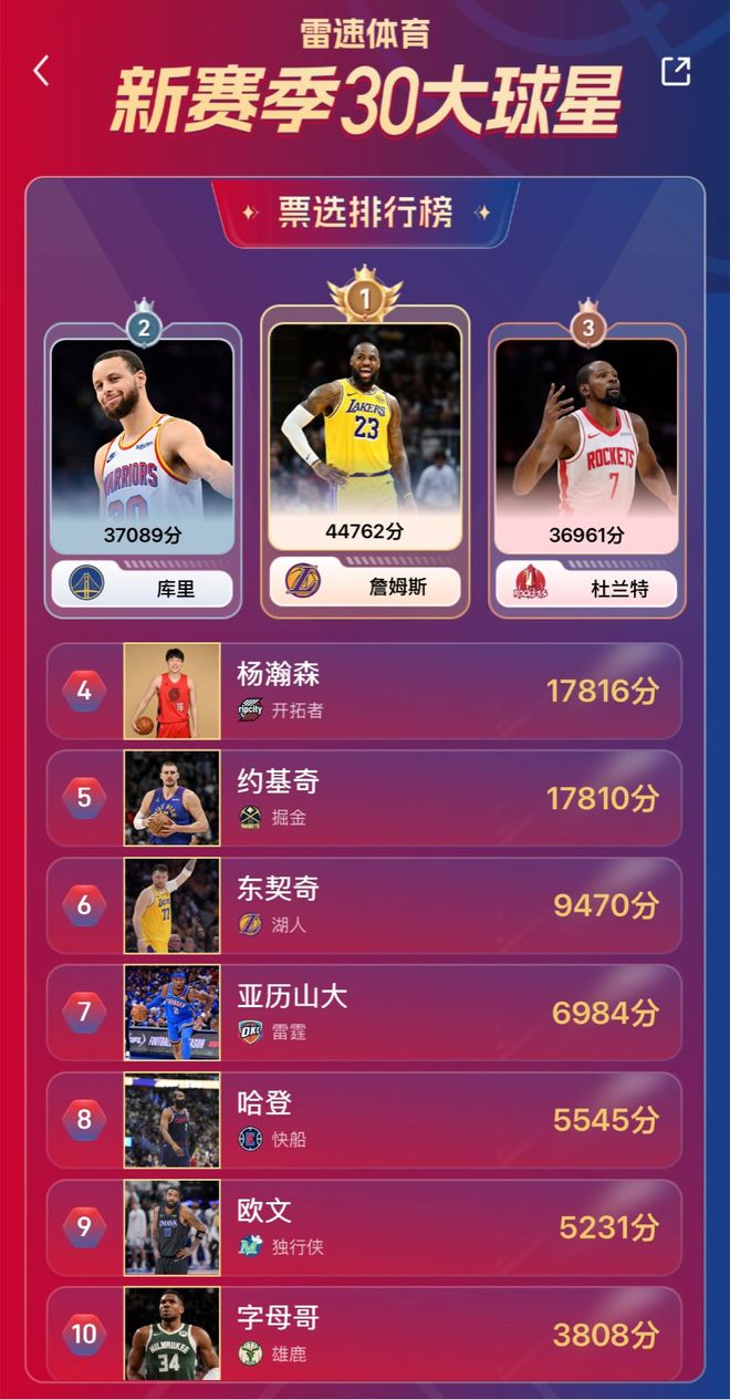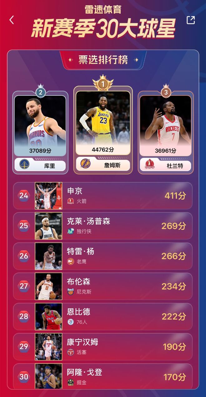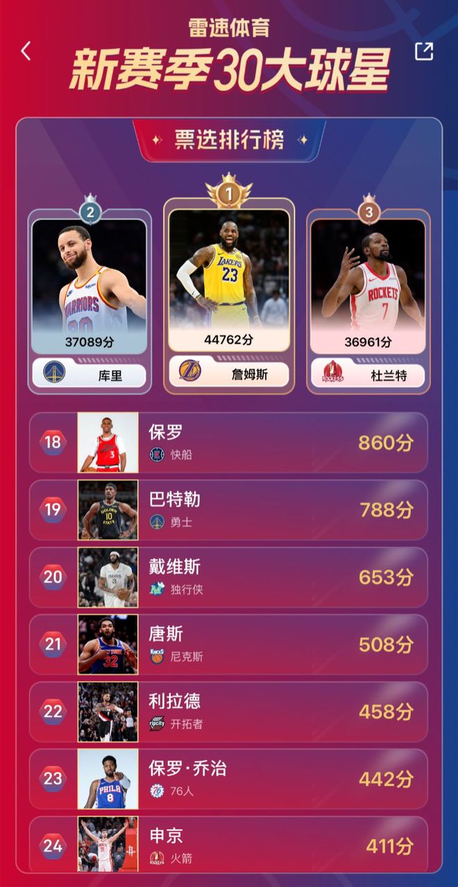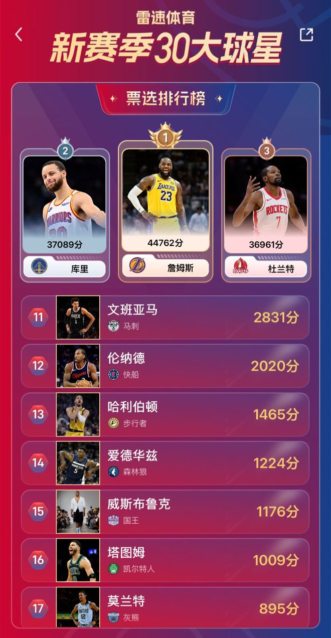 - NBA | 雷速NBA30大球星收官在即,为你喜欢的球星打上最后一Call