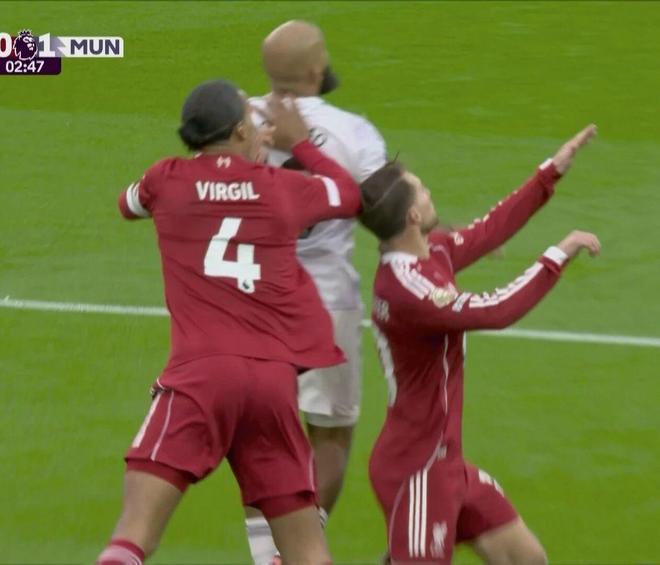 慢镜显示,麦卡利斯特当时后撤与姆贝莫争抢头球,却被队友范迪克意外肘击倒地。阿根廷中场当即抱着头倒地不起,但比赛继续进行,这引发了利物浦的抗议,安菲尔德观众嘘声大作。在曼联庆祝进球时,麦卡利斯特继续接受两名队医的治疗,他的头部随后包上了黑色的护具。
