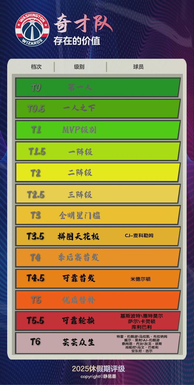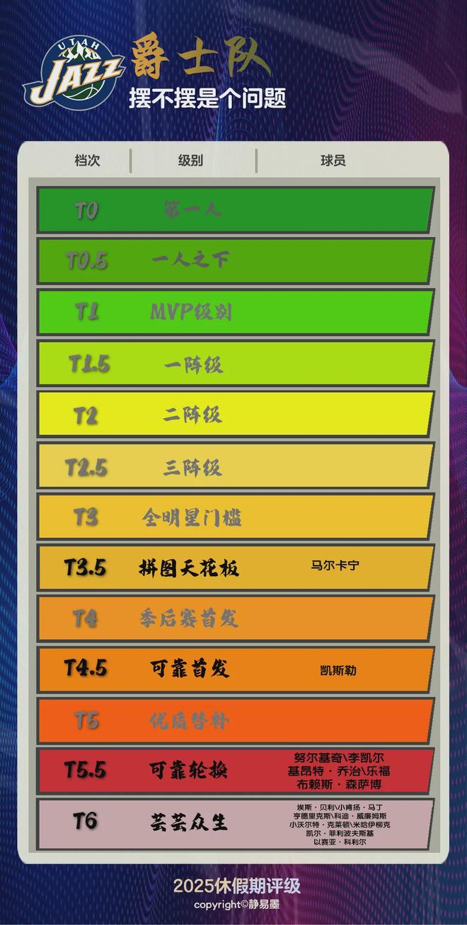 这是4支球队中相对有点谱的。这么讲并不代表爵士的建队进度多顺利,更多是基于对他们队史的尊重。爵士有不靠高顺位选秀孕育出建队核心的案例,还不止一次,这似乎是爵士摆得不够烂的底气。22-23赛季,爵士37胜,战绩联盟第22,没捞着附加赛又文班杯落后,两边都没顾上。按理说,有了22-23赛季的教训,23-24赛季的爵士应该百尺竿头,起手躺平。然而爵士没这么干,他们全明星前胜率46.4%,全明星后才加速俯冲,最后拿下了联盟第23,比去年就进步了一名。2024年是选秀小年,爵士不上心也可以理解。2025年有分量仅次于文班杯的弗拉格杯,按理说爵士多少该加把劲儿。过去两年吃了膝盖硬的亏,爵士这次涨了教训,原地卧倒不起,斩下17胜,勇夺弗拉格杯冠军。结果各位也知道,好家伙,爵士直呼好家伙???3年摆烂,爵士现在手里的年轻人,顺位最高的是5号签,之后是9号签和10号签。对三年没打过附加赛的球队来说,这可能是最尴尬的成绩。当然,对爵士的年轻人还是看好的:凯斯勒早就打出来了,疑问只是关于他的交易流言,到底是诚心的,还是爵士故意挂涨停板卖出,等手抖的有缘人;亨德里克斯和科迪命途多舛,这俩还得再看看;贝利季前赛炸裂了,走位真有点东西,接球出手动作丝滑,多少平衡了爵士抽签的手黑。担忧的还是他大学一般的罚球命中率,绝对投篮能力到底如何将决定他打法的上限;佩奇她老弟和森萨博,这俩打出来的迹象已经有了,有今年的18号秀克莱顿衬托,俩人的投篮选择也就不是问题。队里有马尔卡宁压阵,还有努尔基奇、李凯尔和乐福这些老将加盟,凑吧凑吧,一套能看的轮换阵容雏形有了,再给你来个烂又不够烂的剧情,那也是不意外的。当然了,爵士可能会处理掉马卡。4600多万的马卡跟当初相比,吸引力是否依旧这不好讲,爵士需要他下个赛季打出统治力。爵士这几年兜售资产的节奏一般,约翰·科林斯套现成果中规中矩,塞克斯顿莫名廉价甩卖,克拉克森约等于割肉,都没卖在高点。但戈贝尔那波吃的足够多,米切尔那波还拿到了成长的马卡,赚够了选择积德,这也说得过去。你很难说爵士的重建不成功,他们确实积累了不少天赋与筹码,在“打造一般顺位巨星”圣体的加持下,搞不好这些家底儿也就八九不离十了。这支球队打一手没有王炸的牌很厉害,但也是凭本事抓不到王炸,何尝不是一种另类的生存艺术。