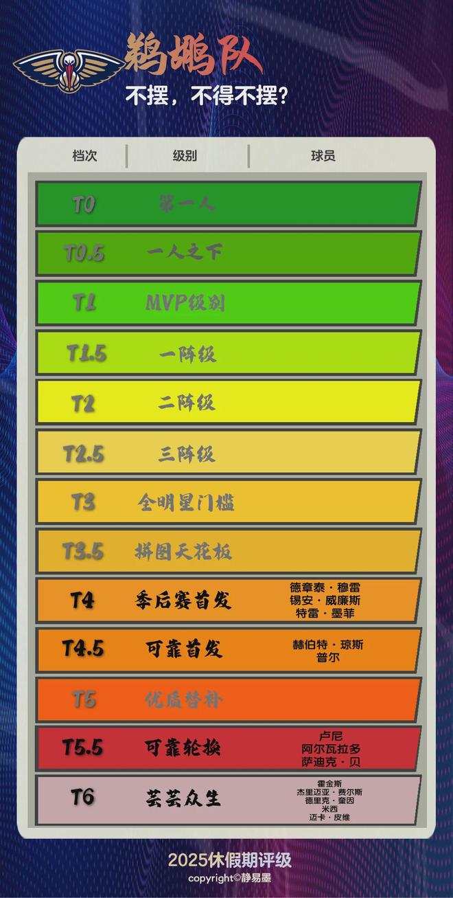 鹈鹕某种程度算爵士的逆向吧。在获取高顺位选秀权方面,鹈鹕是有发言权的,过去15年时间拿到2个状元并列联盟第2,算个不大不小的成就。而这俩状元在鹈鹕的战绩是,一个7年时间打了3轮系列赛,一个自己没打过季后赛。这不能都赖鹈鹕建队拉胯,运气实在不咋地,伤病一堆还专门伤核心,谁都没招。现在鹈鹕算重建了吗?不算,因为鹈鹕夏天把2026年的自家首轮送走了。如果你要重建,你不可能送走第二年的首轮。尴尬的是,付出如此重量级筹码获得的今年13号秀德里克·奎因起手受伤,仿佛就是去年引入德章泰·穆雷的剧情重现。好在奎因伤势不重,没有去年穆雷赛季报销那么大的影响,但这个事跟鹈鹕过往的霉运共振就很诡异,让你不得不相信风水问题——咱卢姥爷在勇士这几年化身铁人,去鹈鹕还没打球又伤了。哎,不知道怎么评价鹈鹕。普尔说,他跟胖虎磨合后将非常恐怖,我只知道上一次恐怖的主角是他和怀斯曼。胖虎能上演浪子回头金不换的剧情吗?他跟普尔这对胖虎&大雄组合,想一想有那么一点进攻契合度。但哥俩就像初中班级里最羡慕外面黄毛又当不了黄毛的假混混,想上道大哥都嫌他们不靠谱。德章泰·穆雷倒是黄毛气质拉满,能跟大哥搭上两句话,奈何他伤愈复出还有时日,而他那个伤大家都懂,恢复成什么样还得看。鹈鹕的内线问题解决了吗?米西、奎因、卢姥爷都不像能跟胖虎完美兼容的样子,而即使不谈兼容性,一个二年级中后段内线,一个一年级矮个内线,以及从库里特供转为普尔特供的卢姥爷,真空实力也完全不够看。很难相信鹈鹕是奔着真刀真枪干一个赛季准备的。可送走第二年首轮签就算砸了锅碗瓢盆,这仗打不赢就没下顿了。从这个角度看,隔壁爵士前几年格局还是小了——你看看,不想摆烂的球队应该是这个态度,你那全明星前花拳绣腿,全明星后飞身滑跪,糊弄谁呢!这个联盟会惦记着鹈鹕的,倒不是为胖虎和普尔,而是他们铜雀春深锁菲琼呢!墨菲琼斯这般绝色自然有人觊觎。我就不点名是哪些球队球迷了。哼!