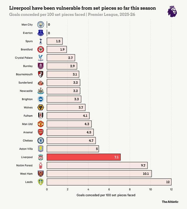 斯洛特对部分球员的信任,并未得到相应的回报。凯尔凯茨的表现再次糟糕透顶,而这位匈牙利左后卫能打满 90 分钟,更是令人费解,要知道,副队长罗伯逊就坐在替补席上。为了给伊萨克腾出位置,埃基蒂克被无情地摁在替补席,但他在对阵曼联时的登场,立刻为球队带来了活力与冲击力——这些特质,正是状态不佳的瑞典前锋(伊萨克)担任首发时所欠缺的。萨拉赫是斯洛特的另一个难题,因为他的产出不足。这位以往常常折磨曼联的埃及球星,在比赛尾声阶段只能沮丧地坐在场边,看着弗林蓬提供他所未能提供的创造力。为加克波送出助攻的基耶萨,则再次在替补登场后表现活跃,这更强化了他理应获得更多出场时间的观点。输给水晶宫、切尔西和曼联的三场联赛败仗有许多共同点。每次都是计划A未能奏效,于是斯洛特在球队落后时孤注一掷。利物浦随后扳平比分,却又在最后时刻遭遇被对手绝杀的心碎结局。这并非巧合。在第60分钟用维尔茨、埃基蒂克和柯蒂斯-琼斯换下脚踝扭伤的赫拉芬贝赫、麦卡利斯特和康纳-布拉德利,可谓大胆。这在最后半小时里实际上形成了一个四人攻击组,维尔茨(他产生了不错的影响)在他们身后活动。但这毫无结构可言,也没有连贯的计划。这不该是卫冕冠军应有的争冠方式。这感觉就像掷骰子,纯粹指望运气。而且,当你在场上有如此多攻击手时,你总是要承担防守暴露的风险。这正是姆贝乌莫的角球进攻射门被挡出,布鲁诺-费尔南德斯将球送回远点时发生的情况。马奎尔偷袭科纳特身后得分,但更令人担忧的是,他身后的德利赫特和多古也处于无人盯防的状态。加克波、琼斯和索博斯洛伊都未能意识到危险,难辞其咎。利物浦上月引进了巴西人路易斯-费尔南多-尤贝尔作为个人发展教练,以便让亚伦-布里格斯能专注于担任俱乐部的定位球教练。然而,本赛季至今,定位球在攻防两端都一直是个弱点。索博斯洛伊对阵阿森纳时的精彩任意球,是利物浦在2025-26赛季57次定位球进攻中唯一的成功收获,这使他们在联赛"每次定位球进攻进球数"榜单上排名第17位。相比之下,周日是他们本赛季第5次在70次定位球防守中失球——只有诺丁汉森林(6次)、利兹联(6次)和西汉姆联(8次)丢得更多。下方图表将各俱乐部面对的定位球次数统一调整为 100 次,以展示它们平均的定位球防守成功率。