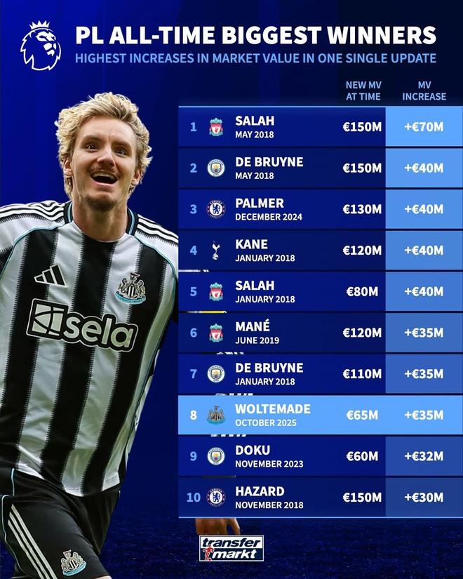 英超历史单次身价涨幅榜:沃尔特马德3500万欧位列第6