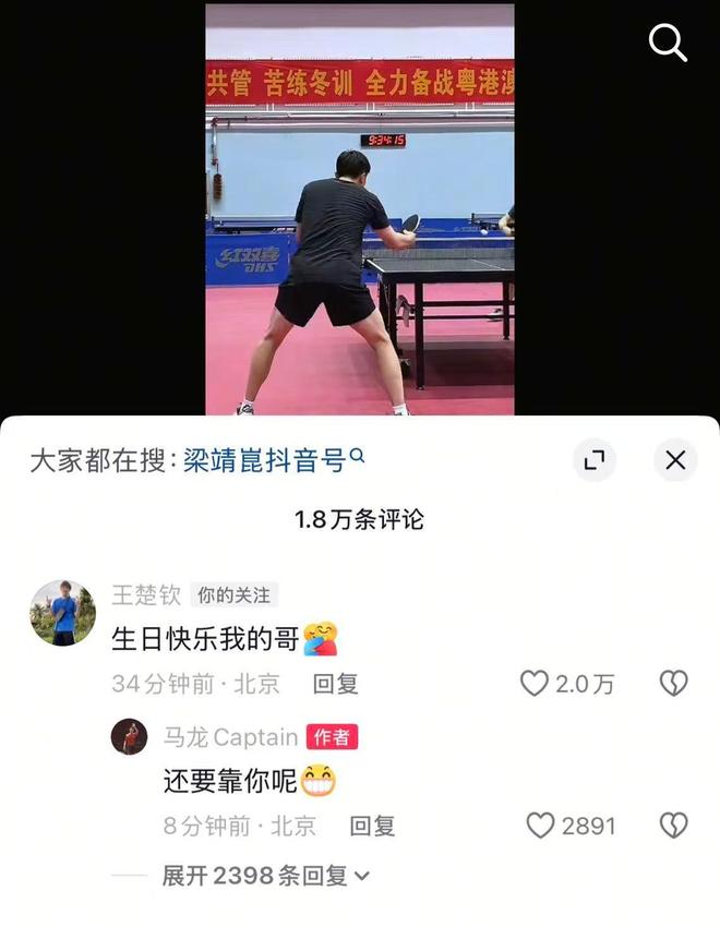 10月20日是奥运冠军马龙的37岁生日,他更新社媒表示正在努力训练、全力备战全运会。王楚钦评论:生日快乐我的哥。马龙则回复道:还要靠你呢!