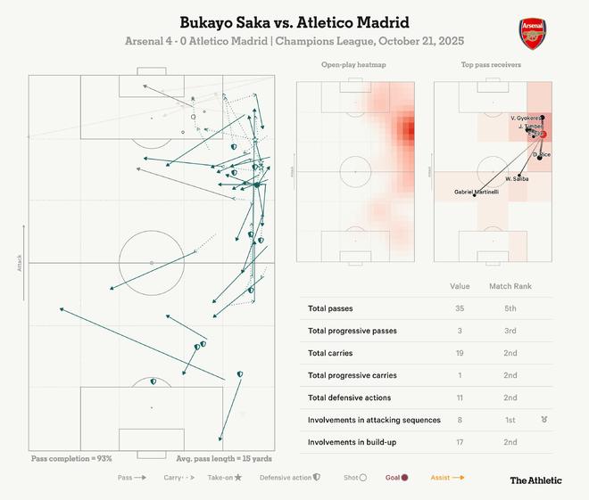 这场胜利说明了阿森纳的什么?能量和势头在足球中至关重要。考虑到阿森纳上半场的统治力,尽管进球并非预料之中,但在首开纪录后,进球如潮水般涌来也并非完全出乎意料。即使面对像马竞这样拥有强大声誉的球队也是如此。四个进球出现在下半场的14分钟内,并且以熟悉的方式开始——通过定位球。这方面的赞誉必须归于赖斯的传球。从任意球后方看去,传中的弧线和高度都如此完美,以至于进球似乎是唯一的结果。几分钟后,刘易斯-斯凯利完成了一次从中场中路的长途奔袭。这位19岁的小将在他本赛季仅第三次首发中已经表现得非常出色,而此刻信心更是回来了。当他带球突破中场时,西蒙尼所能做的只是向后倚靠,在空中踢了踢脚。他几乎是在承认,在这名少年将球传给马丁内利完成射门之前,已经无能为力了。有趣的是,参与前两个进球的每位球员都展现了某种标志性的特点:赖斯的传球、加布里埃尔的头球、刘易斯-斯凯利的奔袭以及马丁内利的远柱端终结。随着现场气氛高涨,剩下的就是等待哲凯赖什进球了。他的第一粒进球略显狼狈,但这丝毫不影响他的状态,在加布里埃尔头球摆渡后,他机敏跟进完成第二粒进球,彻底释放了自己。周末1-0战胜富勒姆的比赛是一场艰苦的磨战。考虑到马竞的强硬风格,本场比赛本有可能重现类似的胶着场面,但阿森纳只需要一粒进球来打开局面。随着势头形成,阿尔特塔将希望球队能将这份状态延续到接下来的比赛中,进一步巩固在国内联赛和欧冠赛场上的优势。这场胜利对哲凯赖什有多重要?进球是每位前锋的氧气。他们靠进球生存,需要进球来维持状态。因此,当哲凯赖什在俱乐部和国家队连续九场比赛未能进球时,人们自然会对这位带领阿森纳进攻线球员的信心水平产生疑问。在球荒之后,迎来的是某种程度的爆发,这位27岁的球员在下半场短时间内梅开二度,击溃了疲惫的马德里竞技防线——两个进球都来自仅仅七码之内的区域。第一个进球再“狼狈”不过了,他在六码区边缘停球,几乎像是与马竞后卫汉茨科完成了一次“抢断”,看着皮球滚入球门角落。他著名的庆祝动作最终还是出现了,但哲凯赖什转身离开球门时,脸上几乎带着一丝窘迫。第二个进球则更加轻松,一记完美传出的赖斯角球找到远柱端的加布里埃尔,后者头球回点,哲凯赖什用大腿将球碰过门线。总而言之,这是他本赛季将打进的最简单的两个进球,但都是抢点破门,为阿森纳锁定了胜局。人们从未期望哲凯赖什能复制他上赛季在葡萄牙体育的数据,大家接受了他适应英超强度需要时间的事实。尽管如此,这是他本赛季在所有赛事中为阿森纳打入的第五球,在欧冠之夜梅开二度,将让经历了一段进球困难期的哲凯赖什能够稍微松一口气了。萨卡有多么不可阻挡?萨卡从十月份国际比赛日归来后,就一直处于某种状态之中。不是坏情绪,而是一种毫不留情的状态。这位边锋在上周末对阵富勒姆的比赛中,将对方后卫瑞安-塞塞尼翁彻底 “拆解”。在克拉文农场球场,他的多项数据冠绝全场:赢得14次对抗、13次在对方禁区内触球、10次夺回球权、创造6次机会、完成6次过人、赢得5次犯规。他对阵马竞时延续了类似的表现,开场几分钟内就让左后卫汉茨科束手无策。他没有选择内切用擅长的左脚,而是自信地走外线,并成功向禁区送出一记有力的低平传中。基调在早期就已定下。