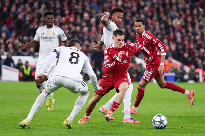 兜帽罩头,双手插在口袋里,球袜卷到脚踝,终场哨响后,维尔茨步履蹒跚地走回球场时,看上去筋疲力尽。在利物浦的头几个月里,他常常给人这种感觉,但这一次不同了。这一次,他显得心满意足。这是一个他们曾向他反复讲述的安菲尔德之夜。利物浦在一种激烈、喧闹、要求足球带着真正激情踢出来的氛围中,击败了强大的皇家马德里。这是一个既需要汗水也需要灵感的场合——而维尔茨,带着重返首发阵容需要证明自己的决心,无疑响应了这一召唤。距离他上一次在安菲尔德首发已经过去了七周。在那段时间里,对他从勒沃库森以预计1.16亿英镑转会而来的兴奋,已被一种细致的审视所取代,这种审视只因看到他坐在替补席上观战而加剧。这是利物浦的一时心血来潮吗?万一,尽管他拥有显而易见的创造力天赋,但没有他的利物浦反而是一支更平衡的球队呢?利物浦主帅斯洛特在这场比赛的前夕为这位德国国脚进行了有力的辩护,而他的对手、曾在勒沃库森执教他的哈维-阿隆索也同样如此。“我毫不怀疑。这只是时间问题,”这位皇马主帅在周一的赛前新闻发布会上说道。“他需要适应,但他确实是一名非常特别的球员。希望(对阵皇马时)不是,但我希望他能尽快展现出他的质量和水平。”在利物浦的头几个月里,他的天赋已有闪现——战胜阿森纳时下半场的强势表现;客战切尔西半场替补登场为萨拉赫送出的那记精妙绝伦的脚后跟撩传;5-1客胜法兰克福时的两次助攻;对阵曼联时替补上场那段活跃的短暂亮相——但这些还不足以让他在塞特担心球队因众多新援而失去平衡时,稳坐首发位置。在这样的背景下,他对阵皇马的表现无疑是他迄今为止最令人印象深刻的。