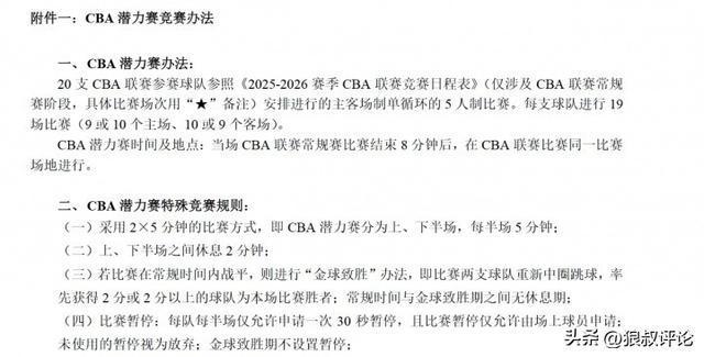 北京时间12月21日,涉及到新赛季CBA出新规,各队都将和其他19个对手在常规赛结束后8分钟额外进行1场潜力赛。