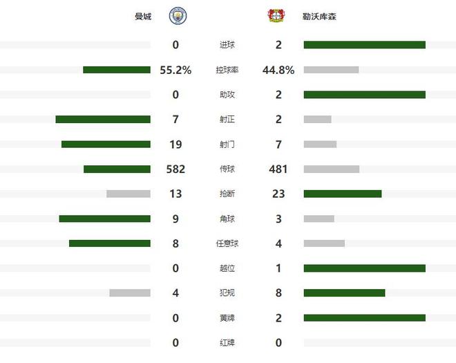 下半场瓜迪奥拉一口气换上了福登、奥赖利和多库,想要加强球队的进攻,不过第54分钟勒沃库森就给了主队沉重一击,身高1米91的大中锋希克,接到队友45°传中后,头球破门得分,帮助勒沃库森将领先的优势扩大到了2球。第65分钟瓜迪奥拉再次做出换人调整,哈兰德和谢尔基披挂上阵,意味着蓝月军团要在主场发起最后的反扑,第71分钟哈兰德禁区内小角度打门被封堵,2分钟之后挪威魔人点球点附近的抽射又放了高射炮,连续浪费机会的曼城,只能眼睁睁看着勒沃库森从自己的主场带走了胜利。