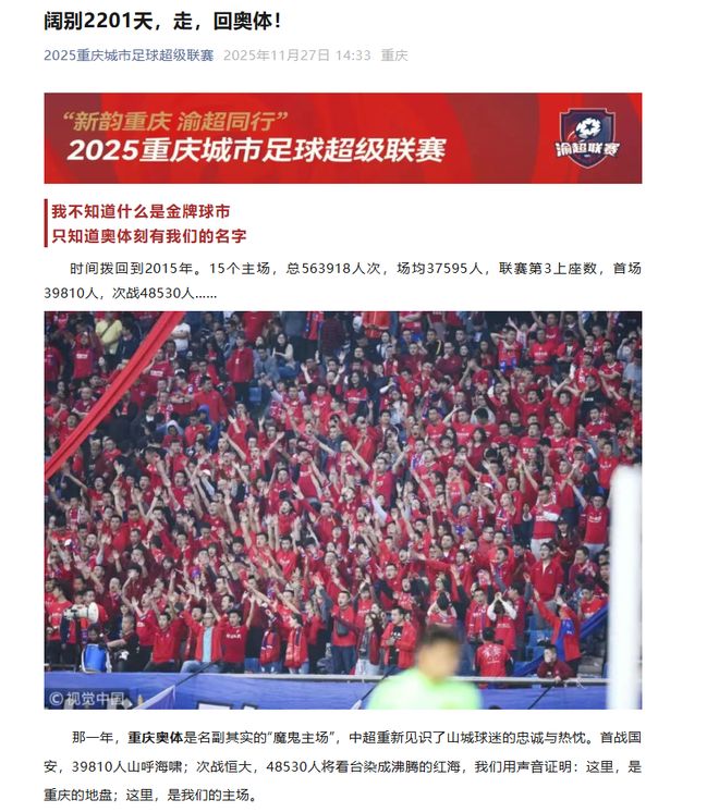 “渝超”官方微信公众号官宣12月6日重回奥体。图片来源/“渝超”组委会据“渝超”组委会透露,本场重回重庆奥体中心的“渝超”联赛因为球迷关注度很高,所以会在明天(28日)上午发布预售公告,售票的平台为大麦。上游新闻记者 赵映骥