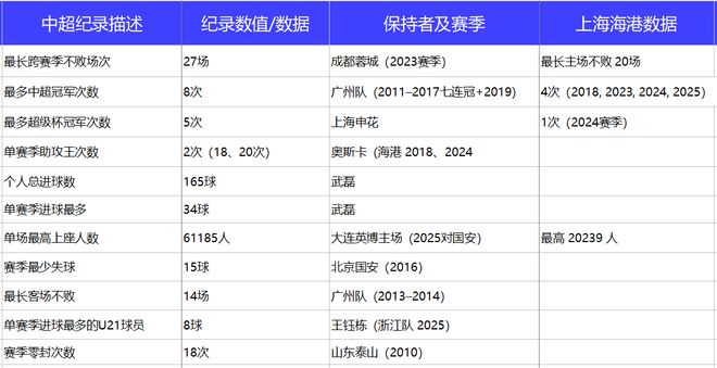 穆斯卡特谈及在中超执教所面对的问题——外界说你们用这种踢法不可能成功。什么踢法?就是传控+进攻式足球。2024赛季他刚执教海港时,赛季前有记者将其说成是“恐怖打法”。面对质疑,如今的穆斯卡特证明了自己。他接着说道:“但我们做到了,还打破了中超历史上所有的纪录 —— 进球数、积分、胜场数,只要你能想到的,都被我们改写了。”海港已打破中超历史上所有纪录?从客观数据看,穆斯卡特这话多少有王婆卖瓜的成分。因为还有很多中超的纪录至今上港也无法打破,比如广州恒大的七连冠等等。下图列举出了一些“能想到的”中超纪录。