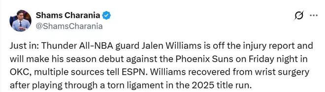 - NBA | 坏消息,雷霆队杰伦威廉姆斯将在对阵太阳队迎来赛季首秀