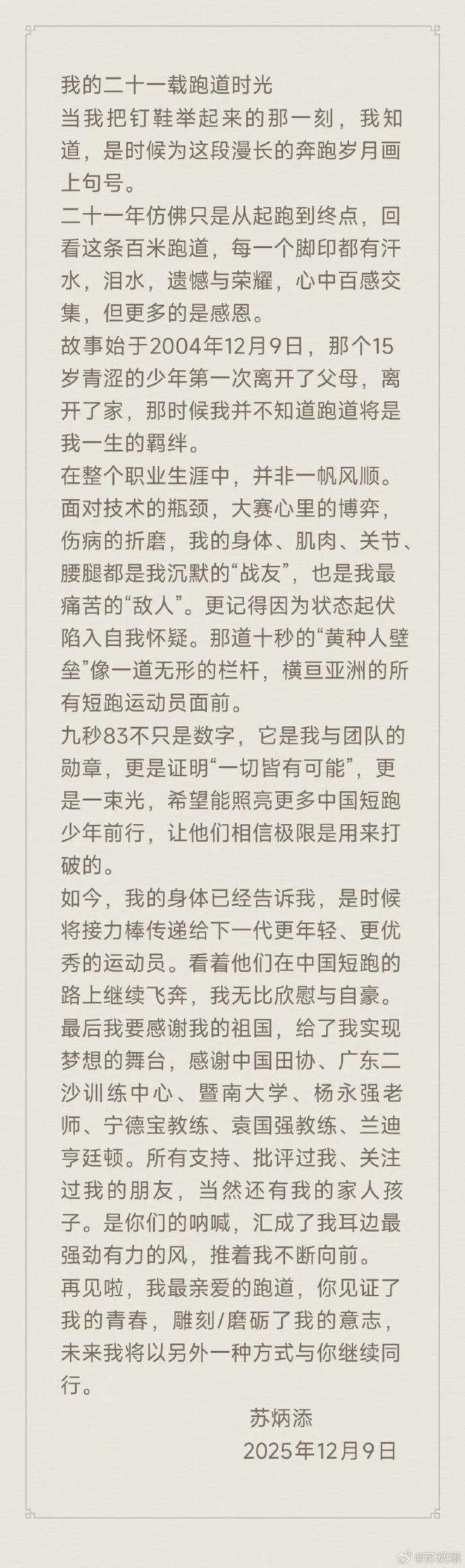 刚刚(12月9日),男子100米亚洲纪录保持者、中国短跑名将苏炳添发布微博宣布退役。