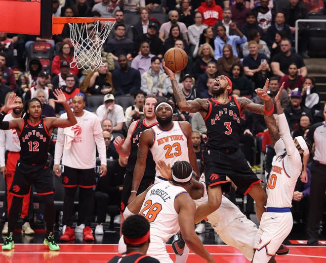 末节巴恩斯一条龙下快攻准备暴扣被布伦森一把拉下来,但裁判没有给犯规,现场球迷高呼裁判太烂了。英格拉姆的上篮被唐斯大帽,英格拉姆两个中投命中也完成30+,但尼克斯回应了两记三分,还剩3分钟英格拉姆还被要求继续打,他登场后感觉双眼都要闭起来打瞌睡了,猛龙进攻还是不中,尼克斯开始消耗时间,猛龙放弃比赛。