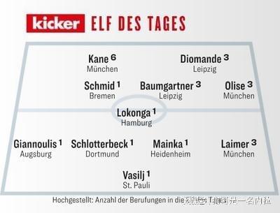完成帽子戏法的拜仁慕尼黑前锋凯恩本赛季第6次入选周最佳阵容,和利物浦、热刺传出绯闻的RB莱比锡天才攻击手杨·迪奥曼德则第3次入选,前阿森纳球员、目前效力于汉堡的比利时中场洛孔加也首次入围。《踢球者》评选德甲第13轮最佳阵容守门员:瓦西里(圣保利)后防线:莱默尔(拜仁慕尼黑)、梅恩卡(海登海姆)、施洛特贝克(多特蒙德)、基尼洛斯(奥格斯堡)中场:洛孔加(汉堡)、斯赫米德(云达不莱梅)、鲍姆加特纳(RB莱比锡)攻击线:凯恩(拜仁慕尼黑)、奥利塞(拜仁慕尼黑)、杨·迪奥曼德(RB莱比锡)