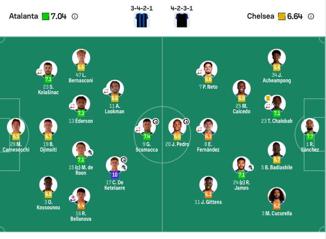 【出场阵容】切尔西首发:1-罗伯特-桑切斯、34-乔希-阿昌庞、5-巴迪亚西勒、24-里斯-詹姆斯、23-特雷沃-查洛巴(46’29-韦斯利-福法纳)(76’4-阿达拉比奥尤)、3-库库雷利亚、25-莫伊塞斯-凯塞多、8-恩佐-费尔南德斯(66’27-古斯托)、11-比诺埃-吉滕斯、20-若昂-佩德罗、7-佩德罗-内托(66’49-加纳乔)。切尔西替补:12-菲利普-约恩森、17-安德雷-桑托斯、21-哈托、32-泰里克-乔治、38-吉乌、40-法昆多-博纳诺特、41-埃斯特旺、50-马克斯-梅里克。亚特兰大首发:29-卡尔内塞基、3-奥迪隆、23-科拉希纳茨(72’69-阿哈诺尔)、19-吉姆西蒂、47-贝尔纳斯科尼、17-德凯特拉雷、13-埃德松-席尔瓦(87’6-尤纳斯-穆萨)、16-贝拉诺瓦(17’77-扎帕科斯塔)、15-德容恩、11-卢克曼(87’8-帕萨利奇)、9-斯卡马卡(72’90-尼古拉-克尔斯托维奇)。亚特兰大替补:4-希恩、10-拉扎尔-萨马尔季奇、42-斯卡尔维尼、44-布雷夏尼尼、57-斯波尔蒂耶洛、59-扎莱夫斯基、70-丹尼尔-马尔蒂尼。