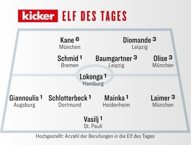 《踢球者》评德甲第13轮最佳阵容:前锋:凯恩(拜仁)、扬-迪奥曼德(莱比锡)中场:施密德(不莱梅)、洛孔加(汉堡)、鲍姆加特纳(莱比锡)、奥利塞(拜仁)后卫:吉安努利斯(奥格斯堡)、施洛特贝克(多特)、迈因卡(海登海姆)、莱默尔(拜仁)门将:瓦西里(圣保利)