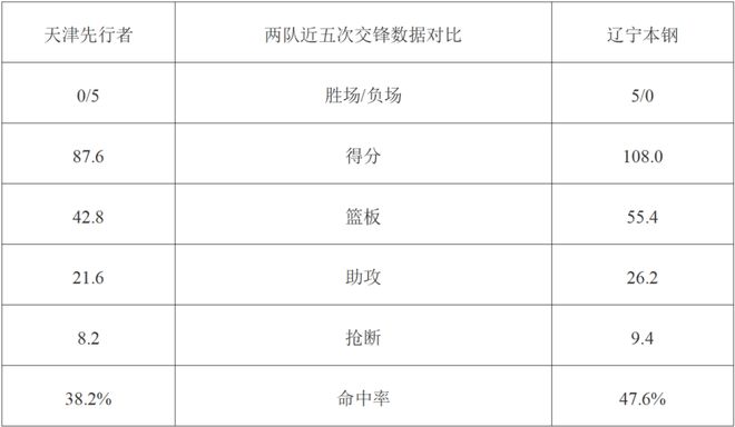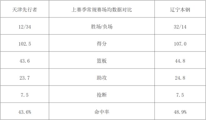 主要球员上赛季常规赛数据:天津先行者:詹姆斯:上赛季常规赛出战45场,场均上场38.8分钟,得到24.6分、14.0个篮板、4.2次助攻、1.3次抢断。林庭谦:上赛季常规赛出战45场,场均上场38.6分钟,得到18.4分、3.7个篮板、6.3次助攻、1.7次抢断。哈姆雷特:上赛季常规赛出战42场,场均上场20.1分钟,得到12.6分、2.3个篮板、3.7次助攻。辽宁本钢:威尔斯:上赛季常规赛出战36场,场均上场32.7分钟,得到21.3分、3.7个篮板、4.0次助攻。姜宇星:上赛季常规赛出战7场,场均上场35.3分钟,得到12.7分、3.7个篮板、2.0次助攻、1.1次抢断。付豪:上赛季常规赛出战45场,场均上场25.8分钟,得到11.1分、5.3个篮板、1.3次助攻。里程碑数据:天津先行者:林庭谦CBA生涯助攻总计为1144次,位列CBA历史助攻榜第47位,距离第46位的胡明轩(1153次)还差9次。辽宁本钢:李晓旭CBA生涯抢断总计为639次,位列CBA历史抢断榜第28位,距离第27位的杨鸣(644次)还差5次。埃里克·莫兰德CBA生涯篮板总计为2336个,位列CBA历史篮板榜第47位,距离第46位的罗德·格里格尔(2344个)还差8个。埃里克·莫兰德CBA生涯盖帽总计为375次,位列CBA历史盖帽榜第26位,距离第25位的兰多夫·莫里斯(378次)还差3次。