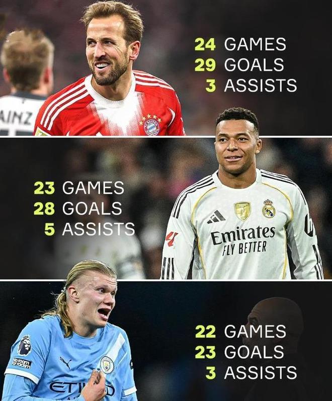 到目前为止,凯恩本赛季代表拜仁出战各项赛事24场,贡献29球3助攻的数据,姆巴佩本赛季代表皇马出战各项赛事23场,贡献28球5助攻的数据,哈兰德本赛季代表曼城出战各项赛事22场,贡献23球3助攻的数据。除了这三大神锋外,五大联赛没有其他人制造进球数达到15+。