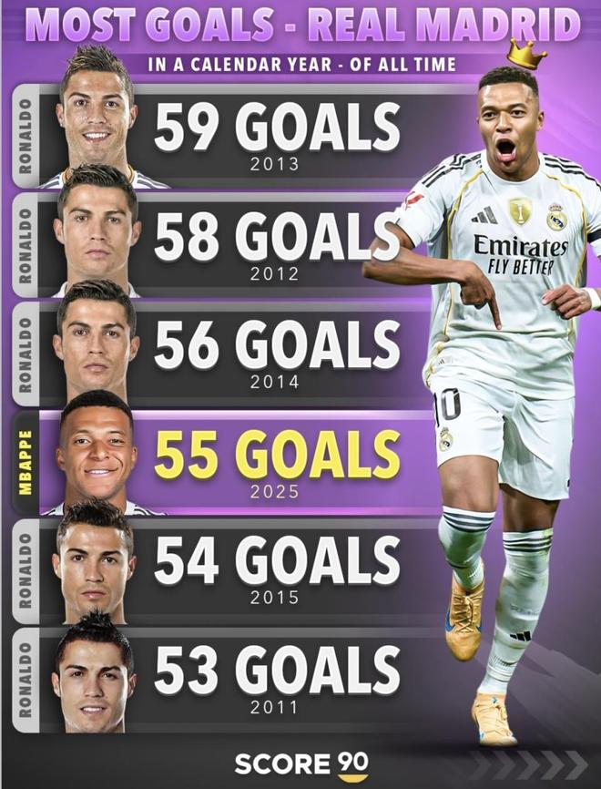 本赛季皇马这条锋线最大的话题,就是姆巴佩在自然年进球上疯狂追赶C罗的历史纪录。如今他已经为皇马打进55球,距离C罗当年的59球只差4个进球,联赛、欧冠和国王杯还留着几场机会。到底他能不能在今年最后一段冲刺里完成反超,改写皇马单年进球纪录,这成了很多球迷最近最关注的问题。(数据截至北京时间2025年12月5日)