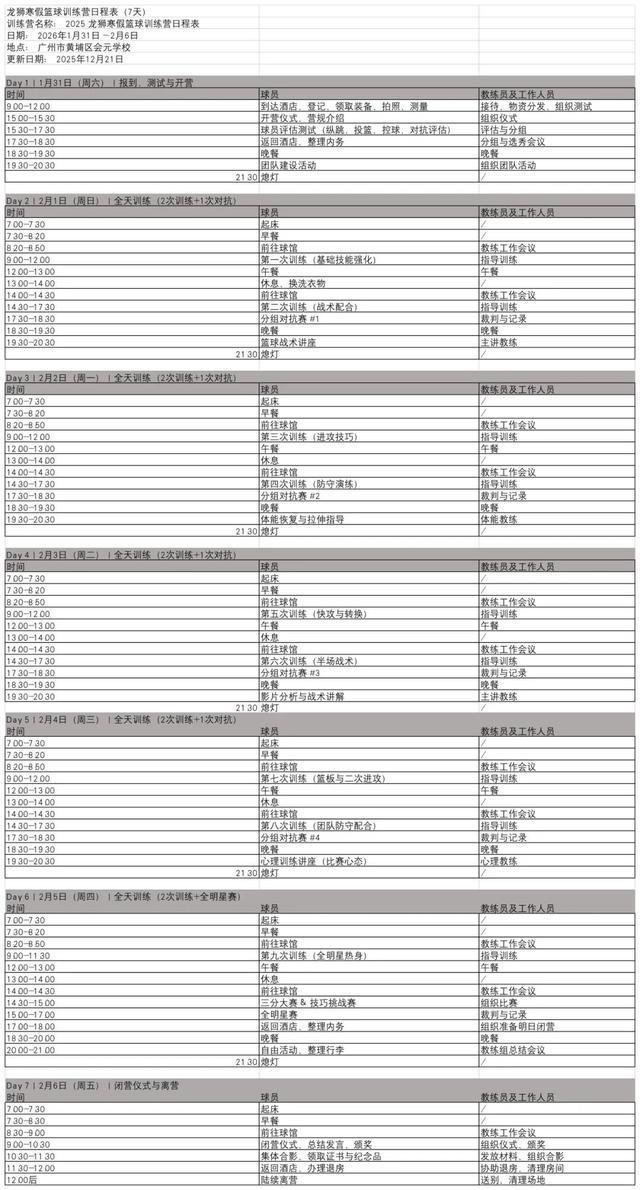 CBA职业教练天团坐镇,体教融合打造专业化青训新路径这个寒假,与广州龙狮篮球俱乐部并肩作战!依托黄埔教育集团与广州龙狮篮球俱乐部的战略合作优势,我们以“体教融合”创新模式,为热爱篮球的青少年铺设一条通往职业梦想的专业化道路。7天封闭式高强度训练,点燃你的篮球火种,迈出坚实的第一步。课程核心:龙狮职业体系深度植入本次训练营深度融合广州龙狮篮球俱乐部的职业青训体系,由俱乐部国际级教练团队全程主导。课程设计科学系统,旨在通过短期高强度特训,全方位提升学员的身体素质、篮球技术、比赛能力及心理素质,并建立专业人才储备库。顶尖教练团队:CBA职业教练天团领衔训练营由CBA广州龙狮俱乐部国际级教练团队亲自坐镇执教。教练团队兼具丰富的职业联赛执教经验与先进的国际青训理念,将前沿的训练体系与方法带入营中,为学员提供真正职业级的指导。特训详情:7天精英选拔营营期时间:2026年1月31日(周六)— 2月6日(周五)(7天6夜)训练地点:广州市黄埔区会元学校专业场馆招生规模:限招60人(分U10-U13、U14-U15两个年龄组,各30人)招生对象:10-15岁有一定篮球基础的青少年日程亮点:训练营以“评估-训练-选拔”为主线。开营日即进行全面的身体素质与技能评估测试。随后五天,每天安排两次高强度专项训练(涵盖基础技能、攻防技巧、战术配合、快攻转换、篮板球、团队防守等)及分组对抗赛,晚间辅以战术讲座、影片分析、心理训练等课程。第六天举办精彩的三分大赛、技巧挑战赛及全明星赛。最后一天举行闭营仪式,颁发证书与纪念品。全包式尊享服务,专注训练无后顾之忧费用包含所有核心项目,真正实现一站式体验:专业训练:全程由龙狮教练团队指导的系统训练课程。五星食宿:入住五星标准酒店,享受营养师调配的一日三餐。全面保障:全程覆盖的运动保险,配备专业跟拍摄影及生活老师全程照料。龙狮礼包:获赠专属定制的训练装备大礼包。投资梦想:超值价格与专属优惠标准费用:7800元/人早鸟优惠:前20位报名学员享 6999元/人 特惠价。区域补贴:在黄埔区就读的学生可享 6800元/人 的专项优惠价。费用涵盖训练、住宿、餐饮、保险、装备、摄影及管理全部项目。报名与选拔通道我们旨在发掘潜力新星。入选学员将进入“龙狮青年训练营人才储备池”,获得持续关注与培养机会。报名截止:2026年1月20日报名方式:提交线上报名表 + 个人篮球经历简介咨询电话/微信:13798977053刘老师19225235013林老师• 18027149568林老师• 19878373945薛老师温馨提示:学员需自备篮球鞋与护具,确保身体健康,训练营将统一购买保险。加入龙狮选秀营,用7天汗水见证成长,让职业篮球之路从这里启航!