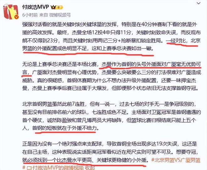 说到外援名记付政浩更是一针见血,怒批北京队,他表示,一经对比,北京男篮的外援配置成色明显不足,这和上赛季总决赛如出一辙。他明确指出,首钢的短板就在于外援不给力。他对北京队的休赛期的操作感到不解,“CBA已经连续两个赛季施行外援四节七人次了,外援的重要性无须再赘言,我就没明白,为什么不要预算花在找靠谱的外援身上呢。就现在CBA这些本土球员,哪个能打出外援水准呢?看不懂”付政浩不但帮北京队把脉,还给北京队提出了解决问题的办法,他指出,想要夺冠,就必须找到一个比杰曼水平更高、关键球更稳健的小外援。