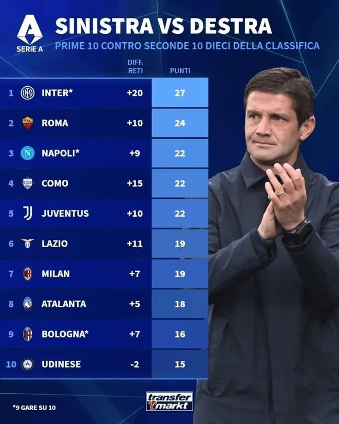近日,德国足球转会市场网站统计了本赛季意甲目前排名前十的球队对阵下半区球队所得积分的排名。在这份榜单里,国米以27分高居榜首。值得一提的是,他们目前只与下半区球队交手9场。换句话说,在这9场比赛中,国米拿到了全胜战绩。如此稳定的虐菜能力,可谓是令人叹为观止。