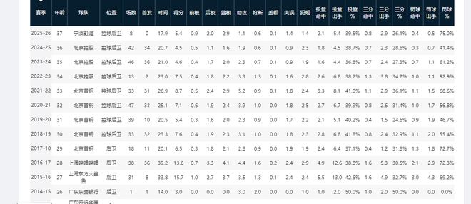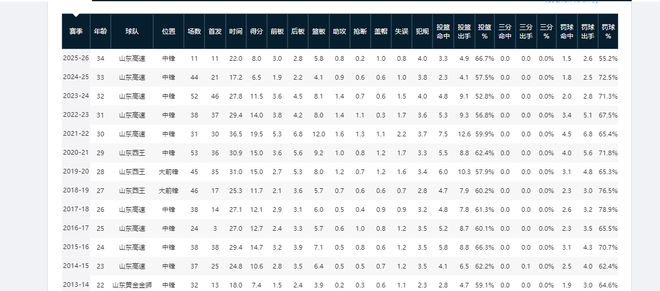 91年球员,自09-10赛季登陆CBA以来,截至25-26赛季,已征战联赛17个赛季,期间一直效力于山东男篮,完全诠释什么叫“一人一城”。
