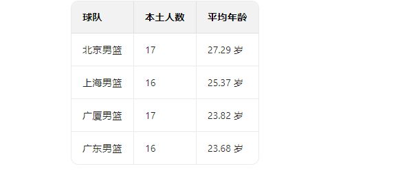 本期内容,来对比下四大豪强球队,上海男篮、北京男篮、广厦男篮、广东男篮在CBA25-26赛季中的阵容平均年龄。