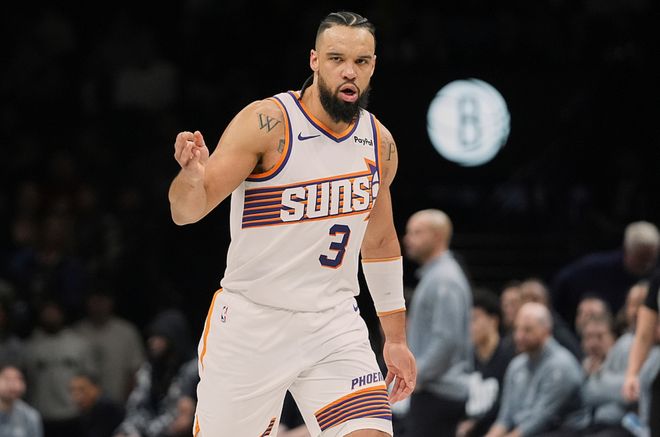 太阳客场挑战篮网,太阳少了杰伦格林,篮网少了托马斯,太阳一度领先20分,篮网一度把分差追到4分,但功亏一篑,最终太阳以9分优势赢下比赛。狄龙15中8(三分9中6)得到27分5板2助,布克18中10得到24分4板4助,吉莱斯皮10中7(三分7中5)得到22分5板5助,篮网方面波特23中10得到23分6板4助2断,克洛尼10中5得到16分。