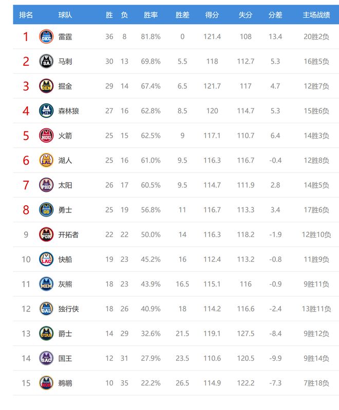 雷霆赢球后36胜8负排名联盟第一。