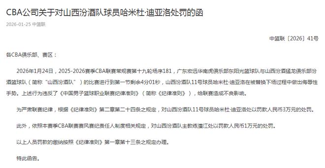 如今CBA官方开出罚单: