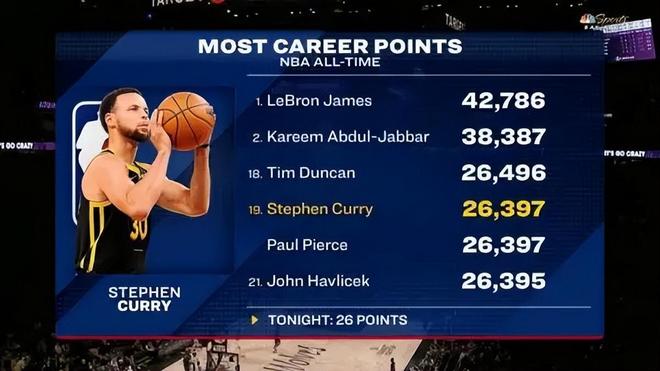 这分数直接让他超越了哈弗里切克,跟皮尔斯并列历史得分榜第19位,距离第18位的邓肯也就差99分。说真的,37岁的年纪还能在得分榜上稳步爬升,库里这状态真的太离谱了!现在球迷圈最热议的话题就是:库里到底还要多久才能冲进历史前十?先跟你们说结论,答案可能颠覆你的认知!